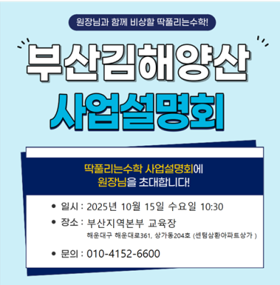 비상교육이 만든 초등 수학 학습관✅️딱풀리는수학✅️사업설명회에 초대합니다. 일시: 25년 10월 14일(화) AM10:30장소: 위례광장로200, 에스비트램스퀘어 902호(주차가능) 🔹️1부: (10:30~11:30) 딱풀리는수학 프로그램소개 🔹️2부: (11:30~12:00) 질의응답